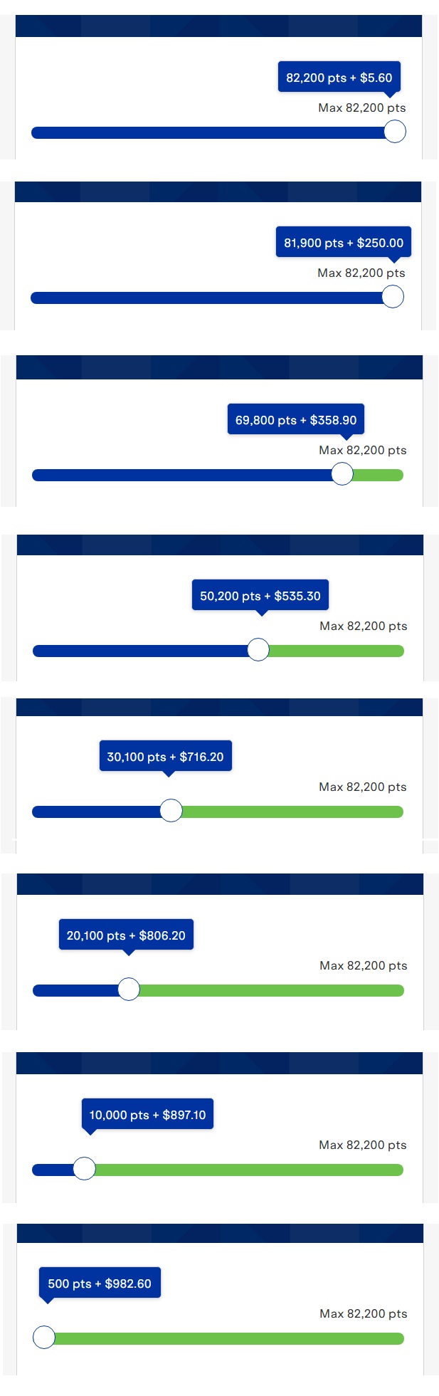 | 81,900 | +$250.00 | This is the worst deal ever. You pay $244.40 more to use 300 fewer points. That works out to you paying 81.5 cents per point. That's 68x the amount you should pay per point! You should get at least 20,000 points value from $244. |